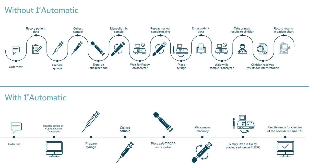 Combine su ABL800 FLEX y las jeringas safePICO con el sistema FLEXLINK de AQURE para utilizar 1st Automatic. La solución conectada registra los ID de paciente, operador y muestra junto a la cama, mientras que FLEXLINK vincula estos datos entre sí. A continuación se muestra un ejemplo de cómo podría acelerar su flujo de trabajo.